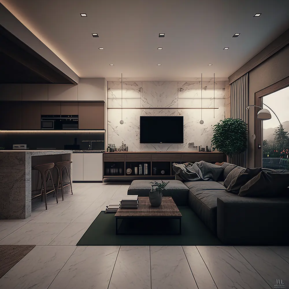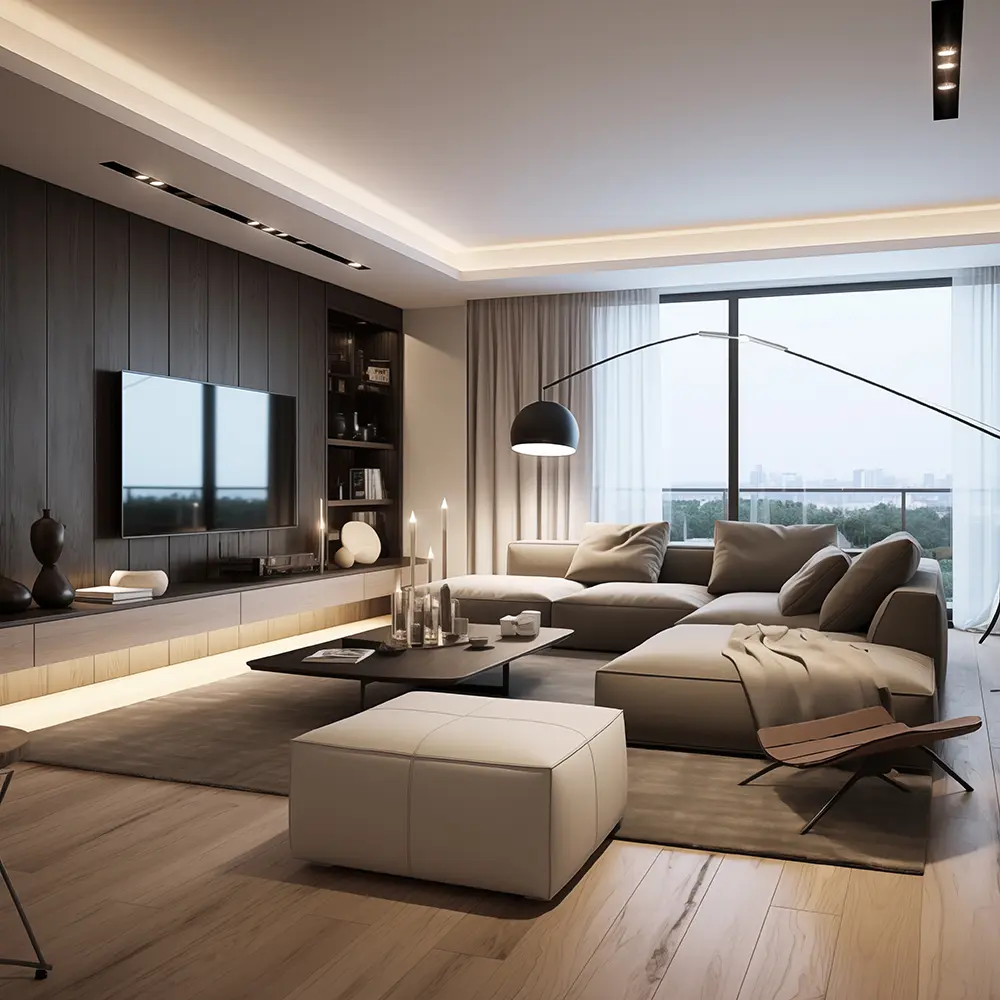 거실은 천장 루멘 조명과 간접 조명의 계층적 구성으로 분위기에 따라 변화를 줄 수 있으며 600mm 이상 대형 타일은 줄눈을 최소화해 공간이 넓어 보이는 효과를 주고 특히 40평 아파트 인테리어에서는 거실의 중앙성을 강조하는 것이 중요합니다.