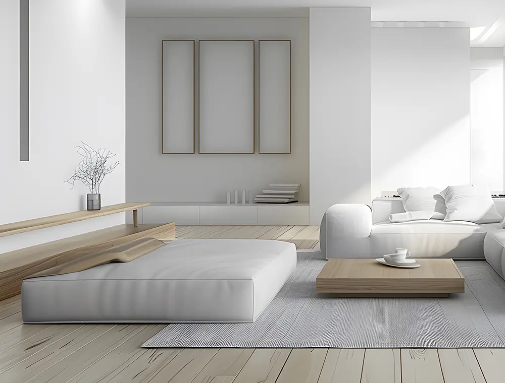 서두에 언급 했듯이 자연 소재인 목재, 석재, 리넨 등을 활용한 거실 인테리어가 특히 주목받고 있는데요. 이는 ‘젠스타일(Zen Style)’로 볼 수 있습니다. 젠스타일은 일본의 선(禪) 철학에서 영감을 받은 미니멀하고 평화로운 디자인을 의미합니다.