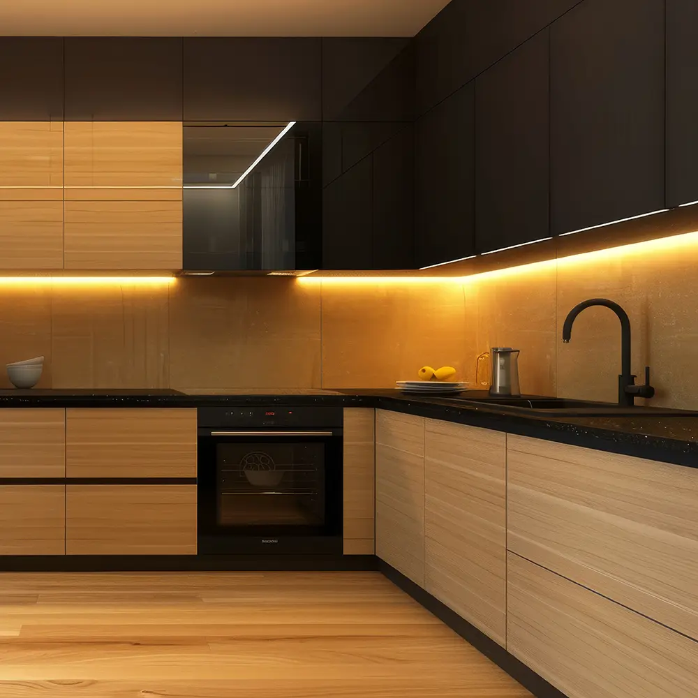 - 부엌가구 선택 : 우드 소재와 미니멀한 핸들이 적용된 가구가 일반적입니다. 특히 수직 수납장이나 슬라이딩 도어를 활용해 공간 효율성을 높이는 것이 중요합니다. 불필요한 장식을 배제하고 기능에 충실한 디자인의 가구가 젠스타일 주방의 완성도를 높여줍니다.