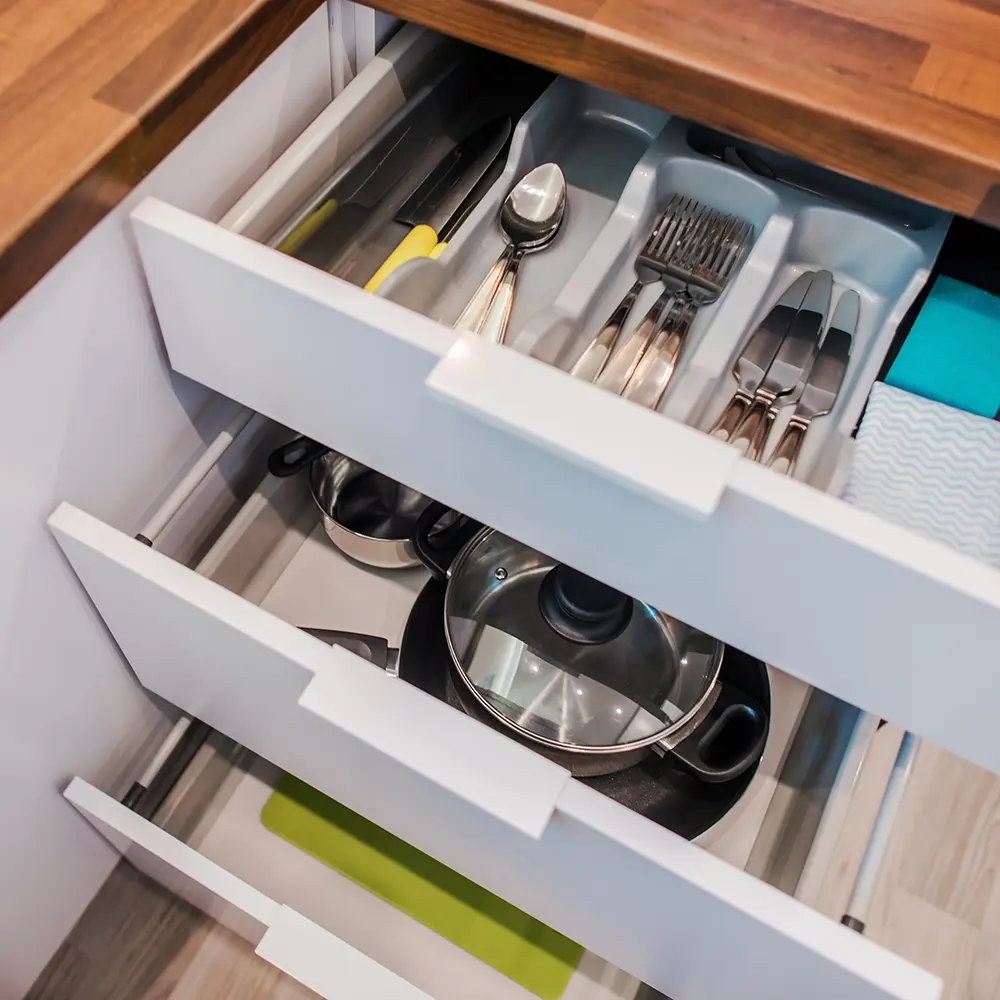 ‘레이어드 수납’은 상부장을 무조건 없애는 개념이 아닙니다. 필요한 구간만 유지하고, 하부장을 서랍형으로 세분화해 수납 깊이를 활용하는 방식입니다. 인출식 팬트리, 코너 회전장, 내부 칸막이 시스템을 적용하면 같은 면적에서도 수납량이 크게 늘어납니다.